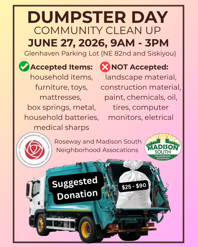 We’re gearing up for the 2026 Dumpster Day! This year in partnership with the Roseway neighborhood Assocation. June 27, 2026, 9am-3pm. Glenhaven Parking Lot (on NE 82nd and Siskiyou)